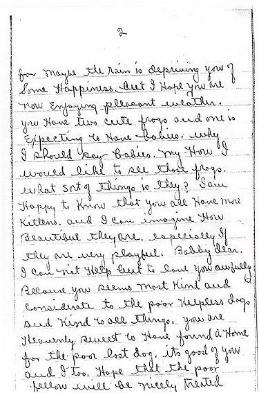 for Maybe the rain is depriving you of Some Happiness, but I Hope you are now enjoying pleasant weather. You Have two cute frogs and one is Expecting to Have babies. My How I would like to see those frogs. What sort of things is they? I am happy to Know that you all Have more kittens. And I can imagine How Beautiful they are, especially If they are very playful. Bobby dear, I Can Not Help but to love you awfully Because you seems Most Kind and considerate to the poor Helpless dogs and Kind to all things. you are Heavenly sweet to Have found a Home for the poor lost dog. its good of you and I too Hope that the poor fellow will be nicely treated |