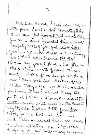 where ever he are. I feel very Sad for the poor Homeless dog. Honestly I do and am glad you all Had sympathy for Him and founded him a Home mighty nice of you. god will bless you for your Kindness to everything. Yes I have seen Dianne, the big Black dog you all Have. I saw Her on the picture with Friend Nina. and what a fine dog you all Have. Now I Have Had two letters from Sister Magnalia. one letter and a postcard that I received today the postcard I mean. I Have answered the letter and will answer the card to night. Also I Had a letter from her little little friend Deborah Garman. and I also answered hers. now since my last Writing you I Have been confined in an infirmary suffering |