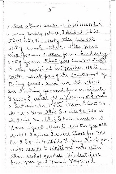 where Atmore Alabama is situated is a very lonely place. I didn't like there at all. why they does all sort of work there. They Have Rice farms. Cotton farms and every sort of farm that you can mention. I also explained in Mother Vail letter about four of the Scottsboro boys Being freed. And we other five are looking forward for our liberty. I guess I will get a Hearing of I mean a decision in my case within short so let us Hope that I will be set at liberty so that I can come and Have a good Visit with you all. well I guess I will close for now and I am Honestly Hoping that you will decide to Write me more often than what you does. Kindest love from your good Friend Haywood. |