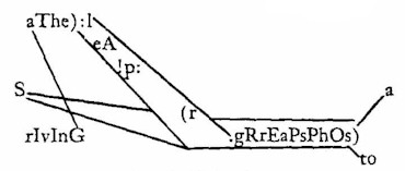For if we look at his "poempicture" as if it were a picture puzzle, we discover to our surprise the rough outline of a grasshopper facing right. Thus "aThe):l/eA/!p:" forms the joint and femur of the hind or saltatorial leg, the "S" on the very left of line 10, which pricks the invisible vertical line of the left margin justification, stands for the sting; "a" on the very right of the same line represents the antenna; "r" is the place where the rubbing of the leg against the wing, the stridulation occurs; "rIvIng" indicates the hind claw on which the grasshopper lands or arrives after a jump; ".gRrEaPsPhOs)" represents the segmented thorax and the head with its compound eye ("0"), leaving "to" for the front claw or toe (the curve described by "S/aThe):1/A/!p /(r" may, of course, also be seen as a diagram of the grasshopper’s jump):